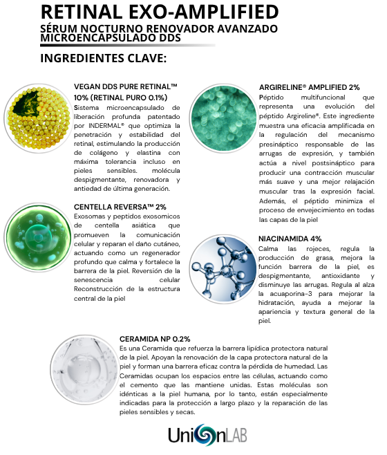 En su núcleo se encuentra el 10% de VEGAN DDS PURE RETINAL️ (Logrando un 0.1% de Retinal Puro), un sistema microencapsulado de liberación profunda que optimiza la penetración y estabilidad del retinal, estimulando la producción de colágeno y elastina con máxima tolerancia incluso en pieles sensibles.